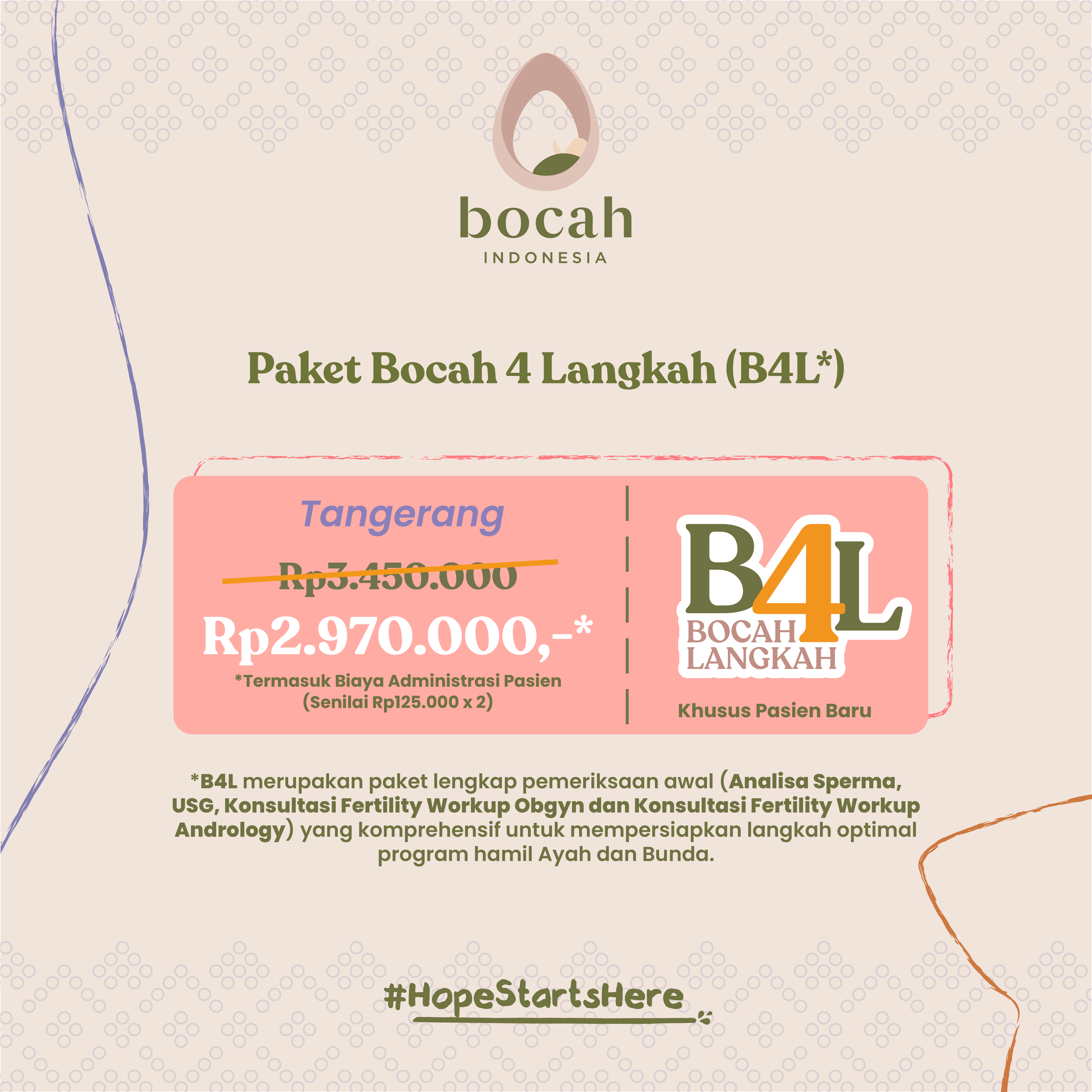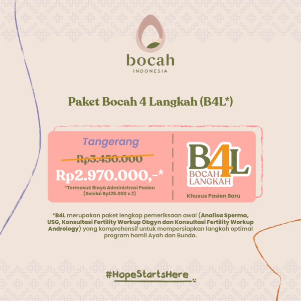 Bocah 4 Langkah / B4L merupakan paket pemeriksaan awal yang komprehensif untuk mempersiapkan langkah optimal program hamil Ayah & Bunda. Layanan ini diperuntukkan bagi pasangan yang sudah menikah, baik yang sudah maupun belum pernah melakukan pemeriksaan sebelumnya dan ingin memulai program hamil.