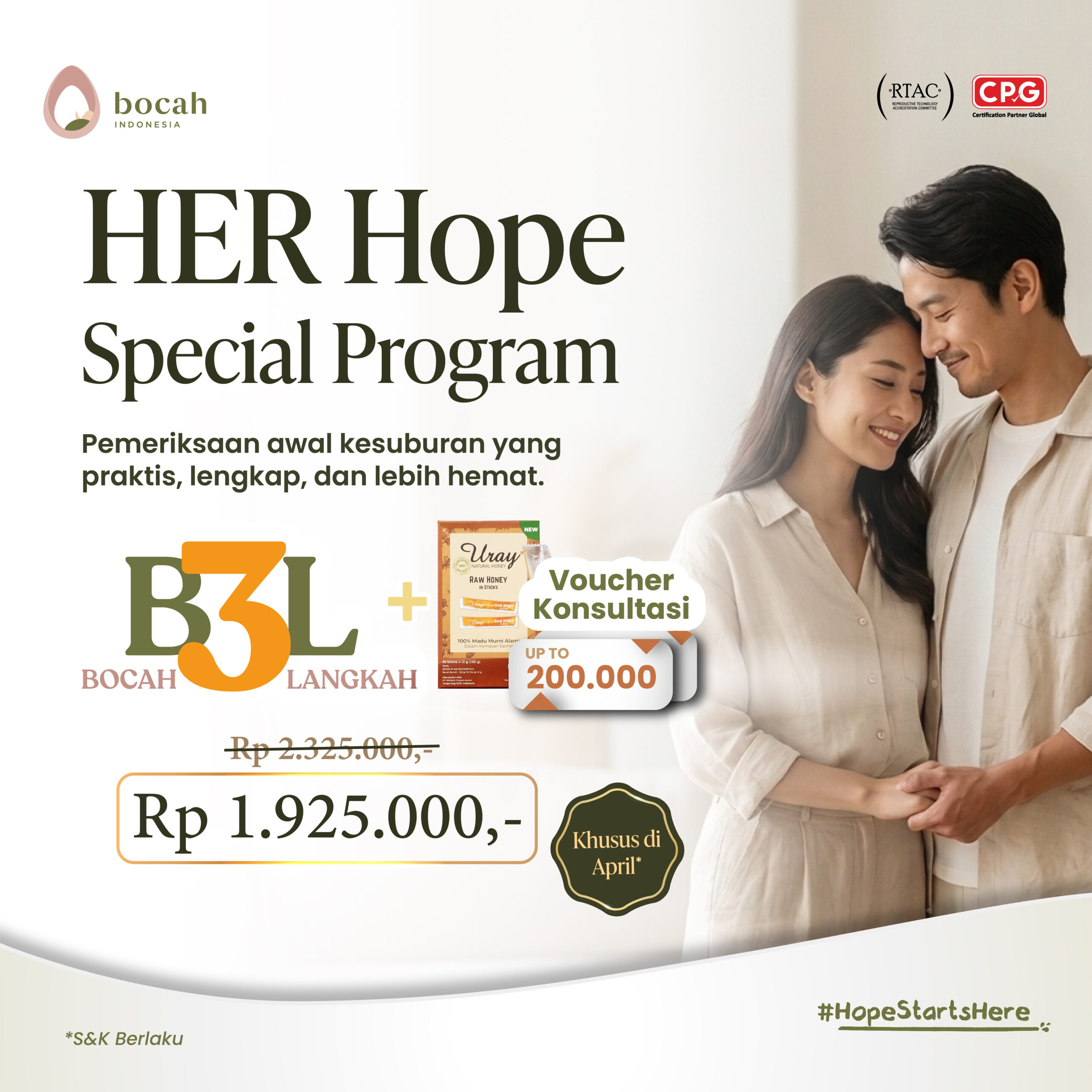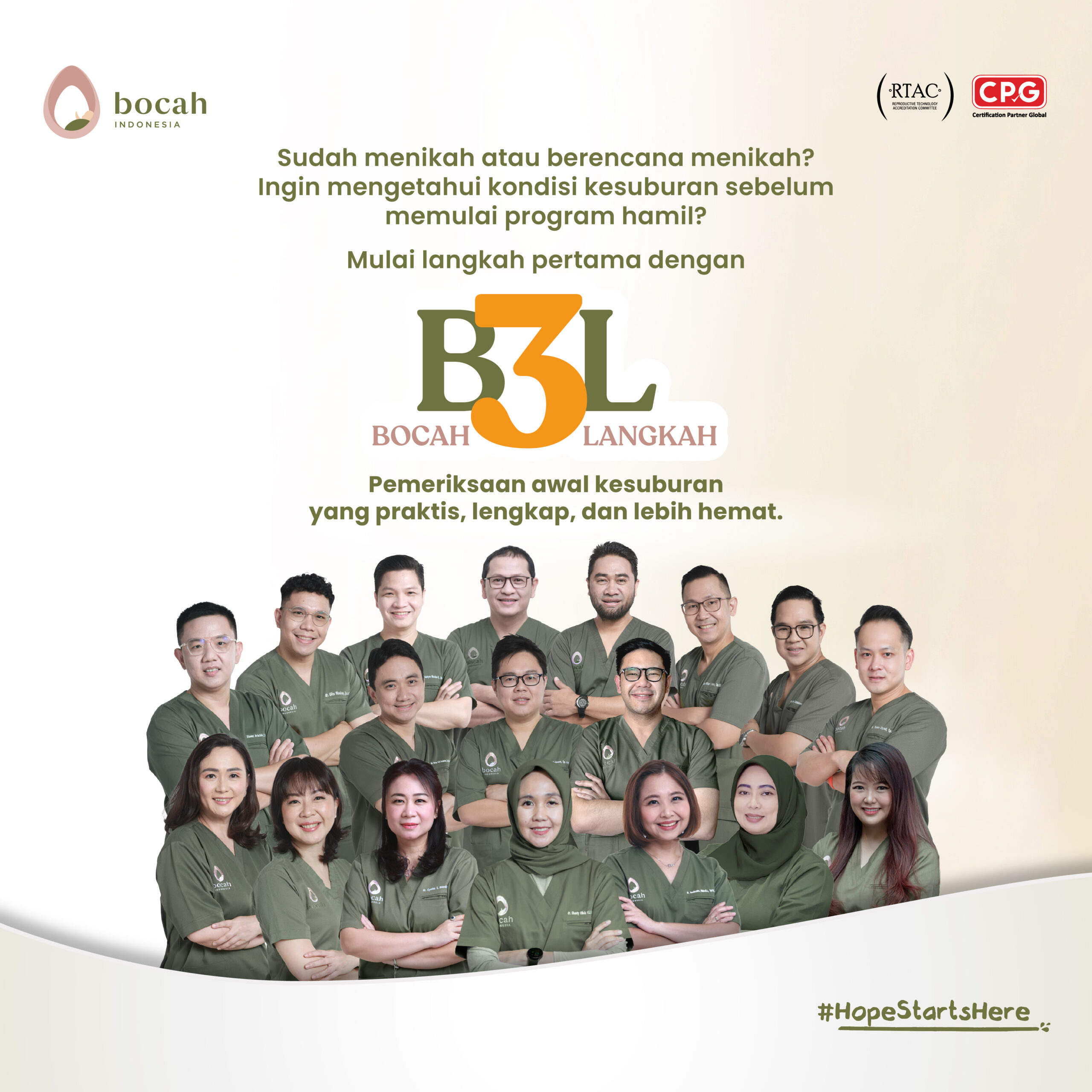 Bocah 3 Langkah / B3L merupakan paket pemeriksaan awal untuk membantu Ayah & Bunda memulai perjalanan program hamil dengan evaluasi dasar kesuburan.