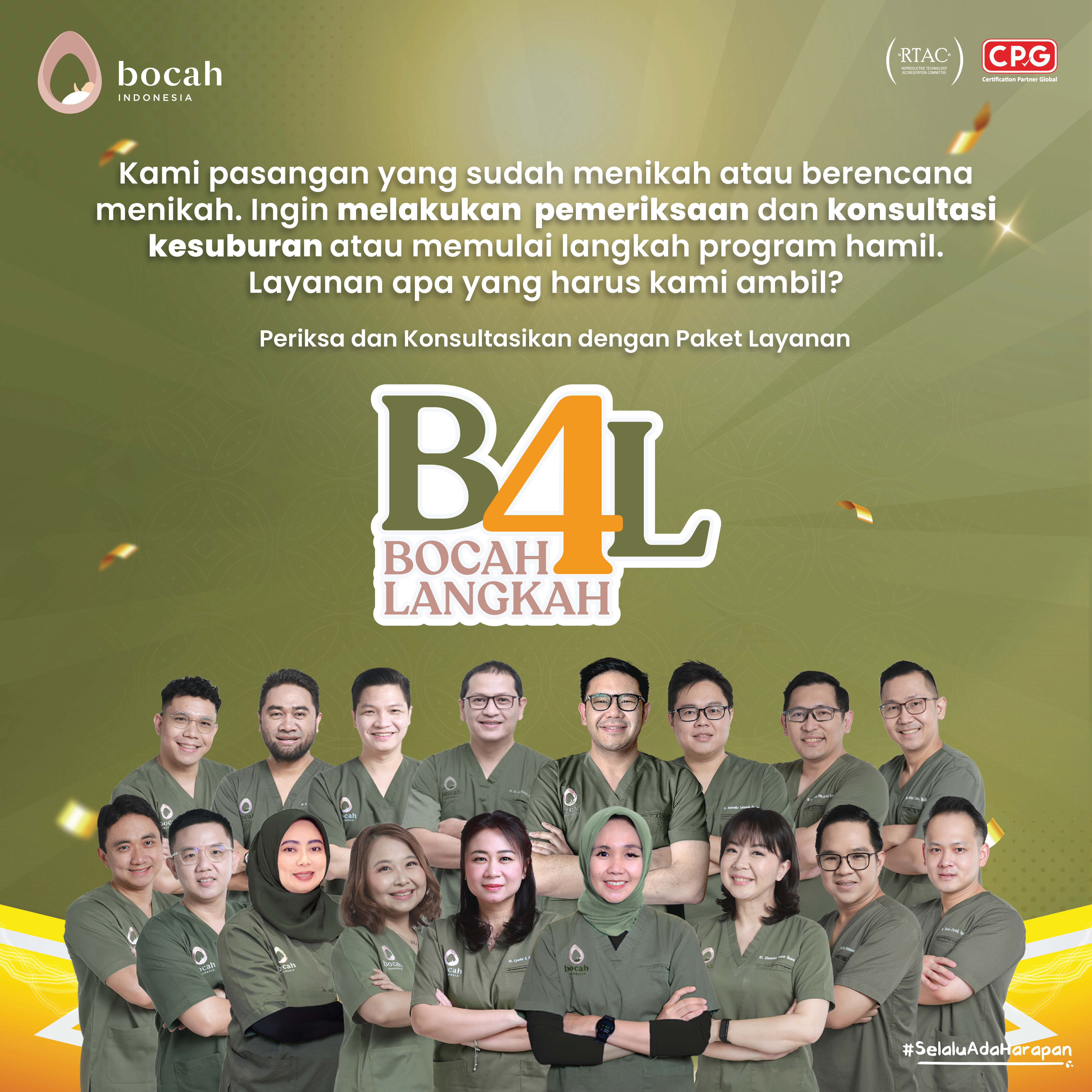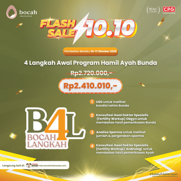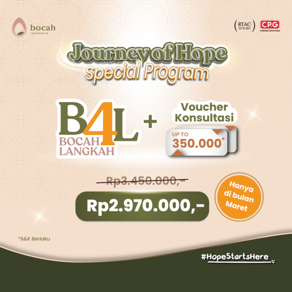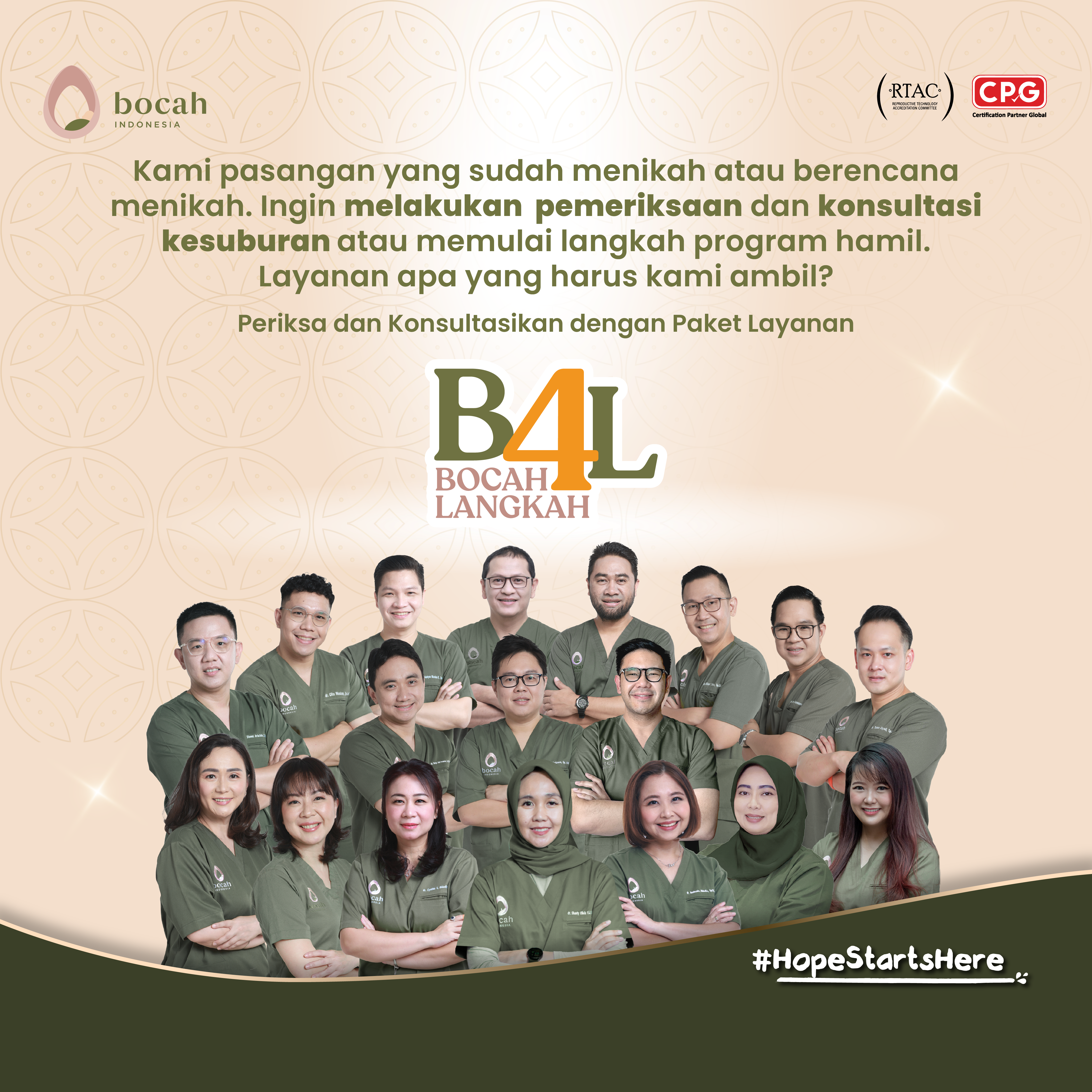 Bocah 4 Langkah / B4L merupakan paket pemeriksaan awal yang komprehensif untuk mempersiapkan langkah optimal program hamil Ayah & Bunda. Layanan ini diperuntukkan bagi pasangan yang sudah menikah, baik yang sudah maupun belum pernah melakukan pemeriksaan sebelumnya dan ingin memulai program hamil.