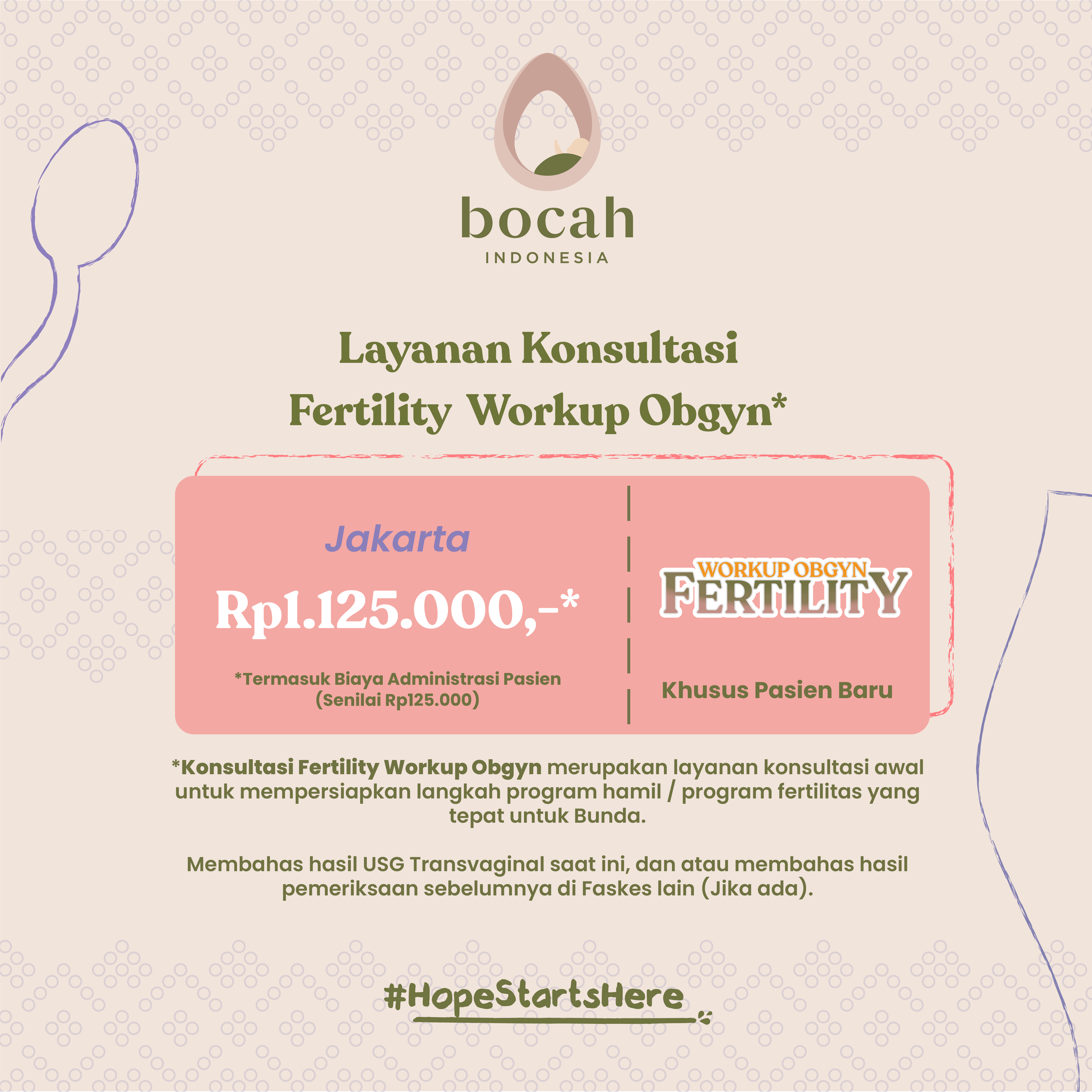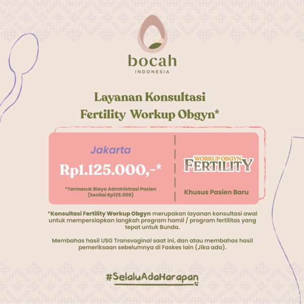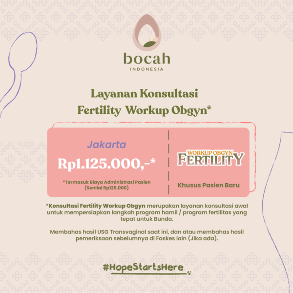 Fertility Workup Obgyn merupakan layanan konsultasi awal untuk mempersiapkan langkah optimal program hamil / program fertilitas yang tepat untuk Bunda.